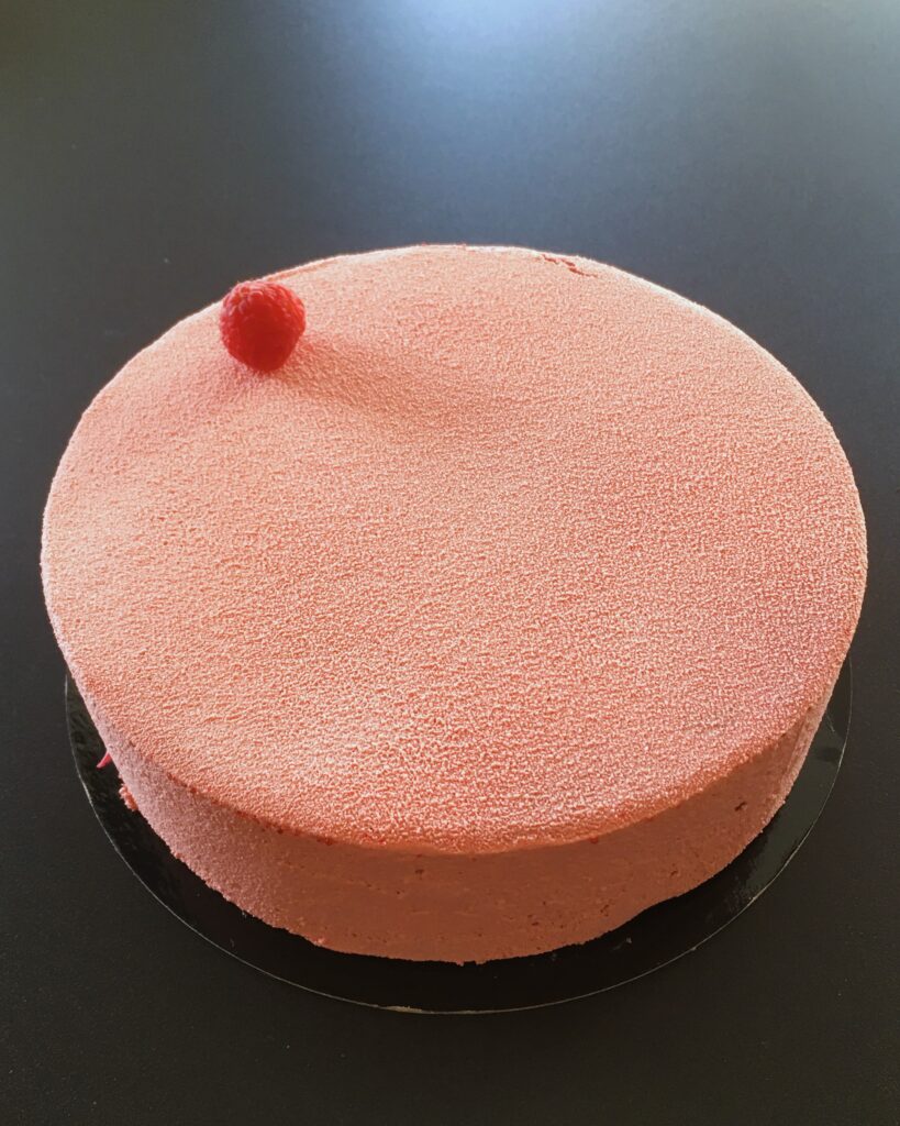 Mousse framboise, biscuit moelleux, croustillant amande